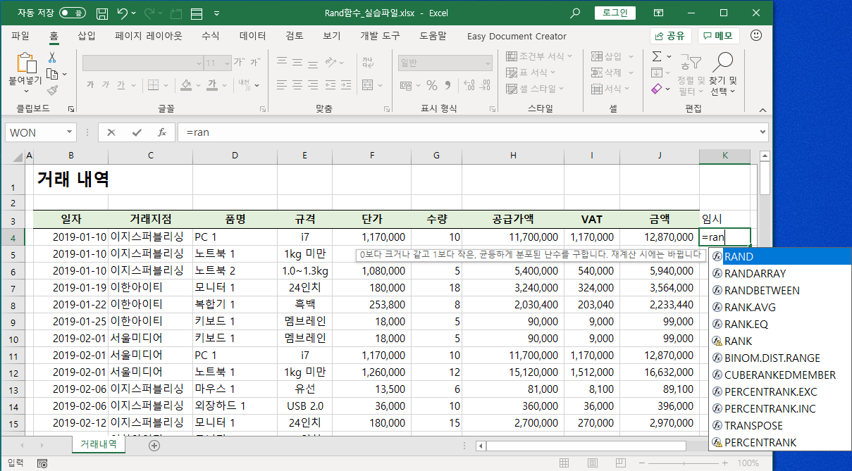 [K4] 셀에 커서를 두고 =ran 까지 입력하면 함수 목록이 나타납니다.