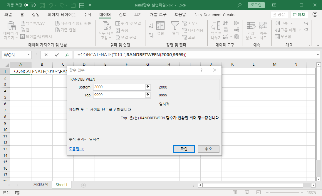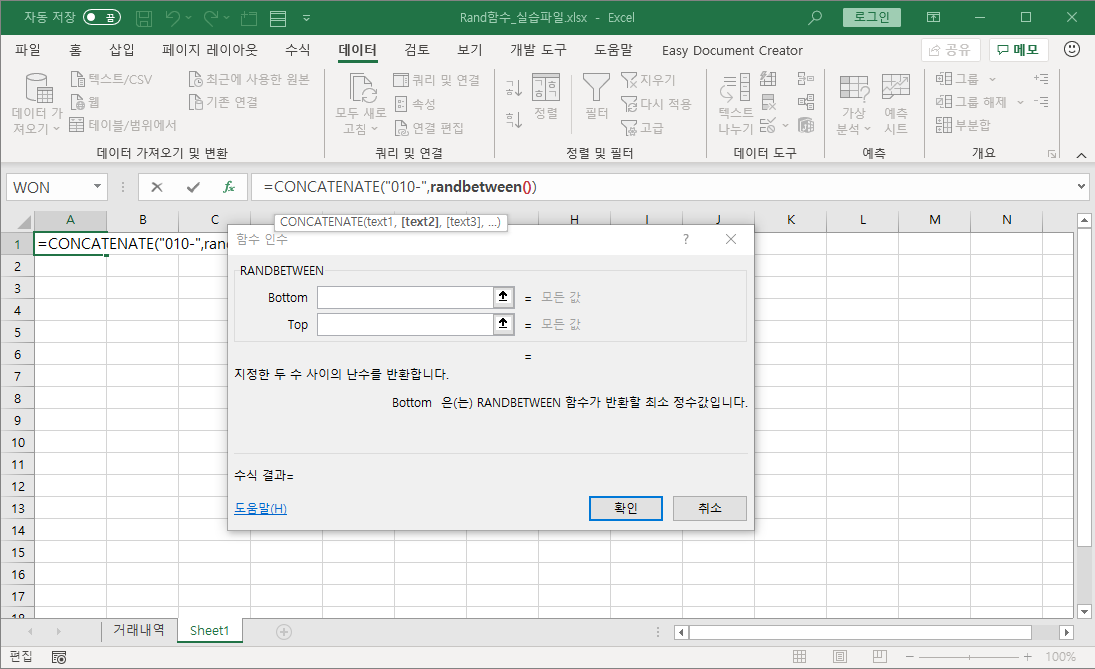 이제 RANDBETWEEN 함수 입력 창으로 바뀝니다.