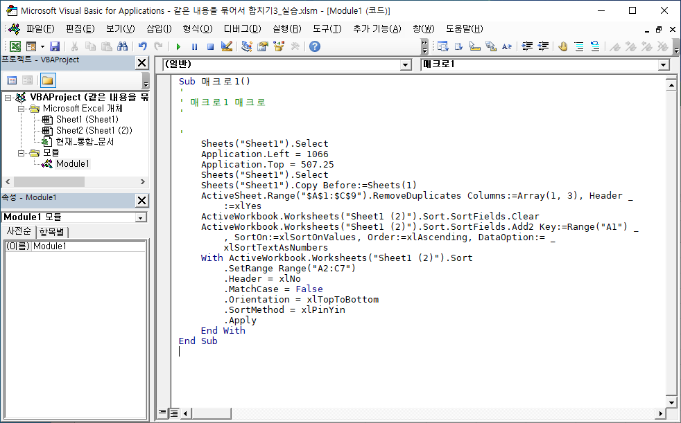 현재 시트를 복사하고, 중복된 항목을 제거한 뒤 정렬하는 작업을 VBA로 어떻게 나타낼 지 코드를 확인하기 위해 매크로를 기록해 봅니다.