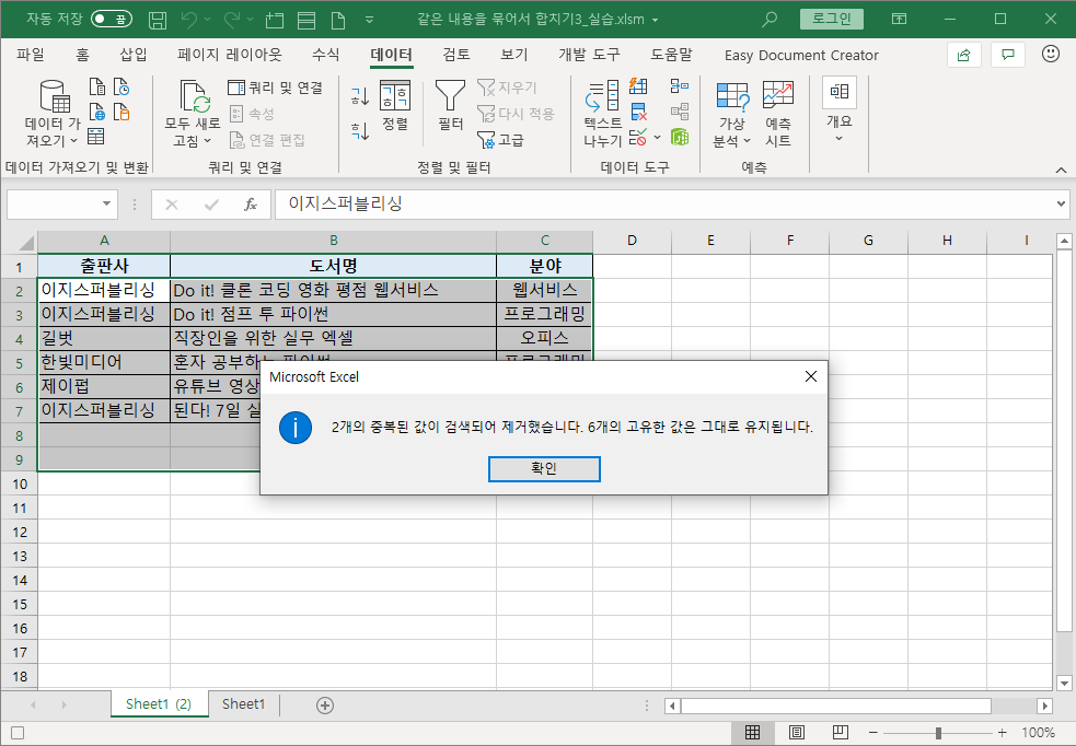 [중복 값 제거] 대화상자에서 '도서명' 열은 체크 해제하고 [확인]을 누릅니다.