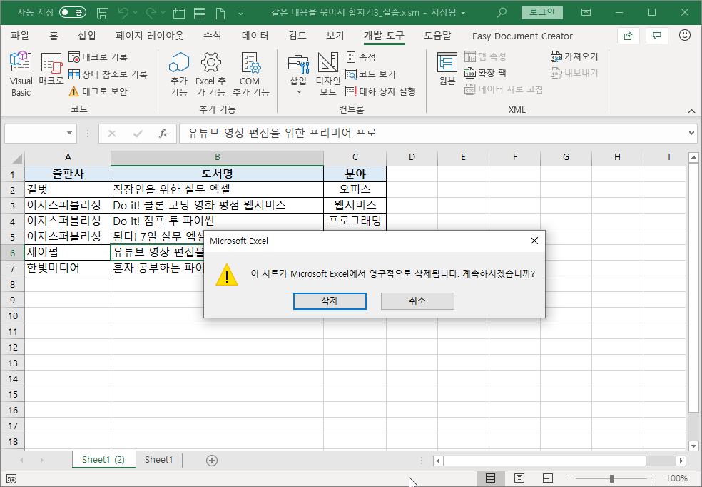 그런데 시트 삭제 코드만 넣으면 '정말 지우시겠습니까?' 같은 경고창이 표시됩니다.