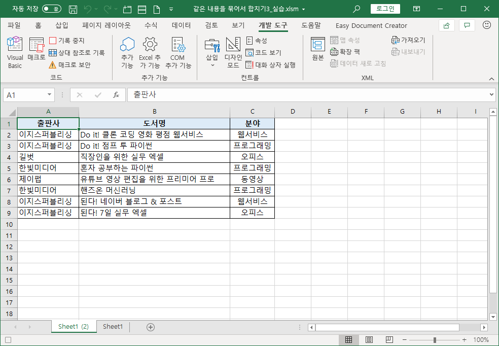 현재 데이터를 새로운 시트에 복사한 다음 [중복된 항목 제거] 기능으로 출판사와 분야가 같은 항목을 없애고, 출판사 필드를 기준으로 [정렬]하는 겁니다. 그런 다음 이렇게 처리된 데이터를 출판사별 분야를 묶어 원하는 결과를 구하고, 작업을 위해 만든 시트는 삭제해서 마무리를 하는 방법입니다.