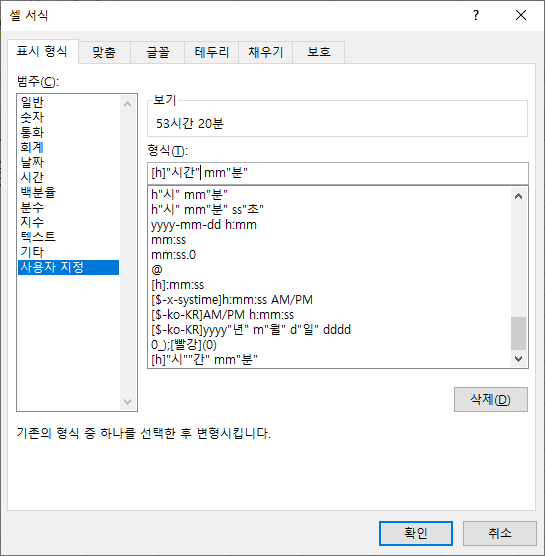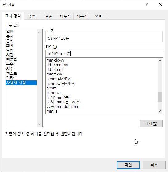 53시간 20분 형식으로 나타나도록 다시 설정합니다.