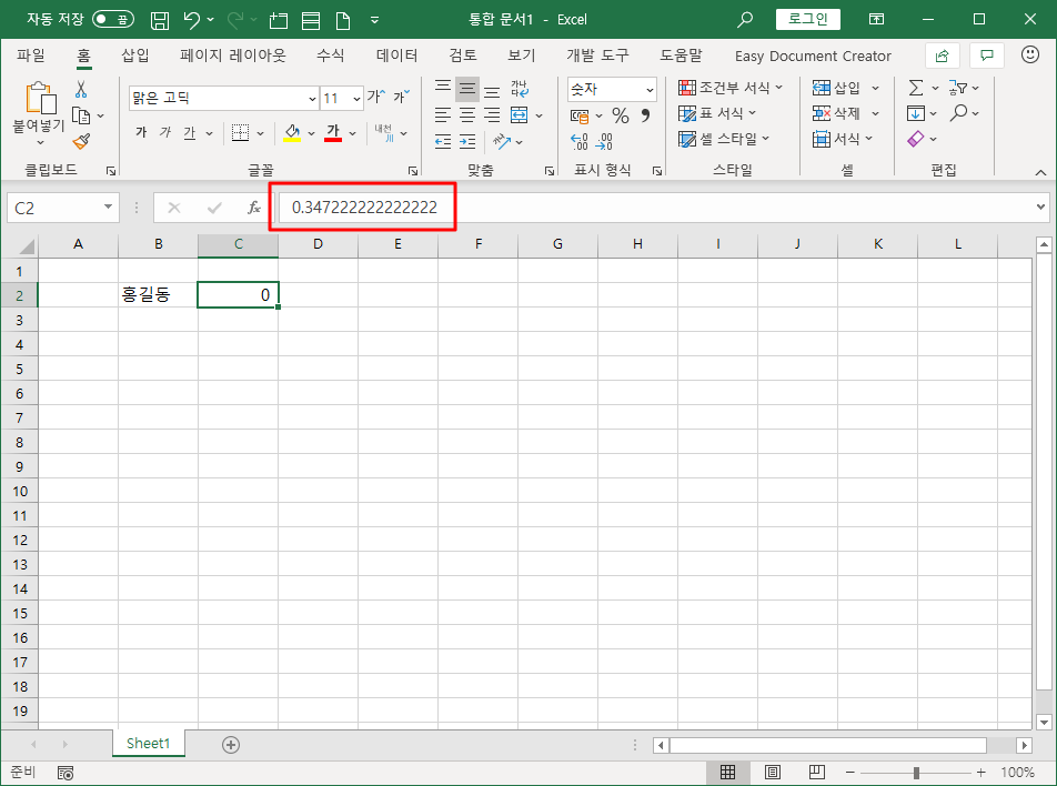 셀에는 0으로 표시되지만 수식 입력줄을 보면 0.347222222222222 소수로 나타납니다.