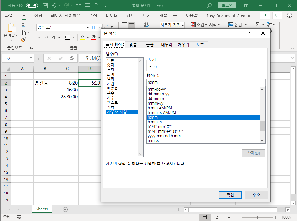 콜론( : )을 지우고 시간과 분을 [h]와 mm 뒤에 적습니다.