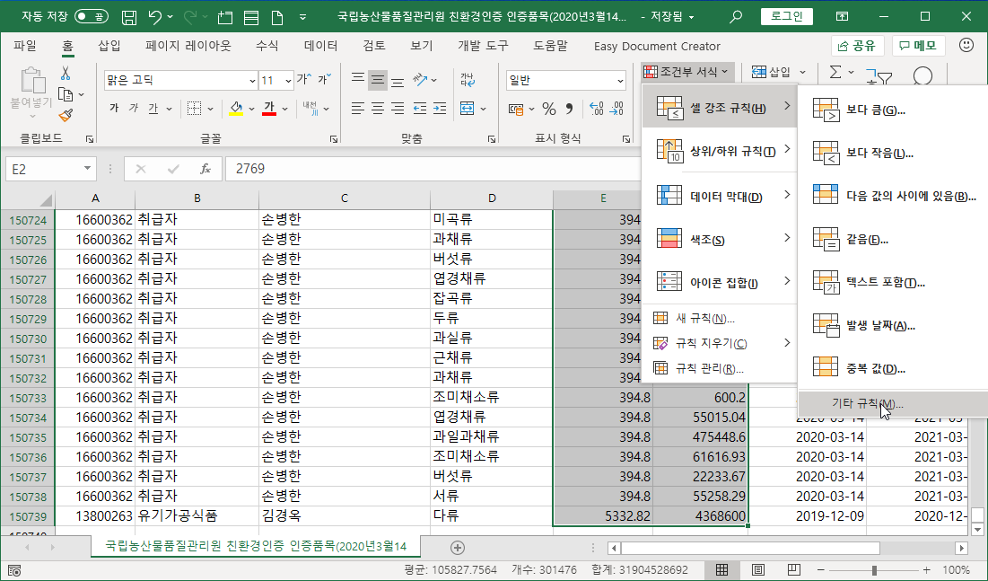 [E2:F150739] 셀 범위를 선택한 상태에서 [홈]-[조건부 서식]-[셀 강조 규칙]-[기타 규칙]을 선택합니다.