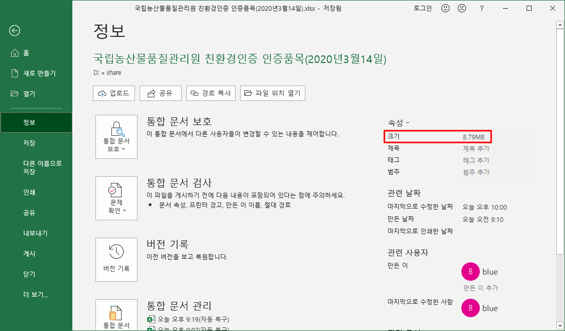 [홈]-[정보]를 선택해 파일 크기를 보면 8.79MB로 줄었습니다.