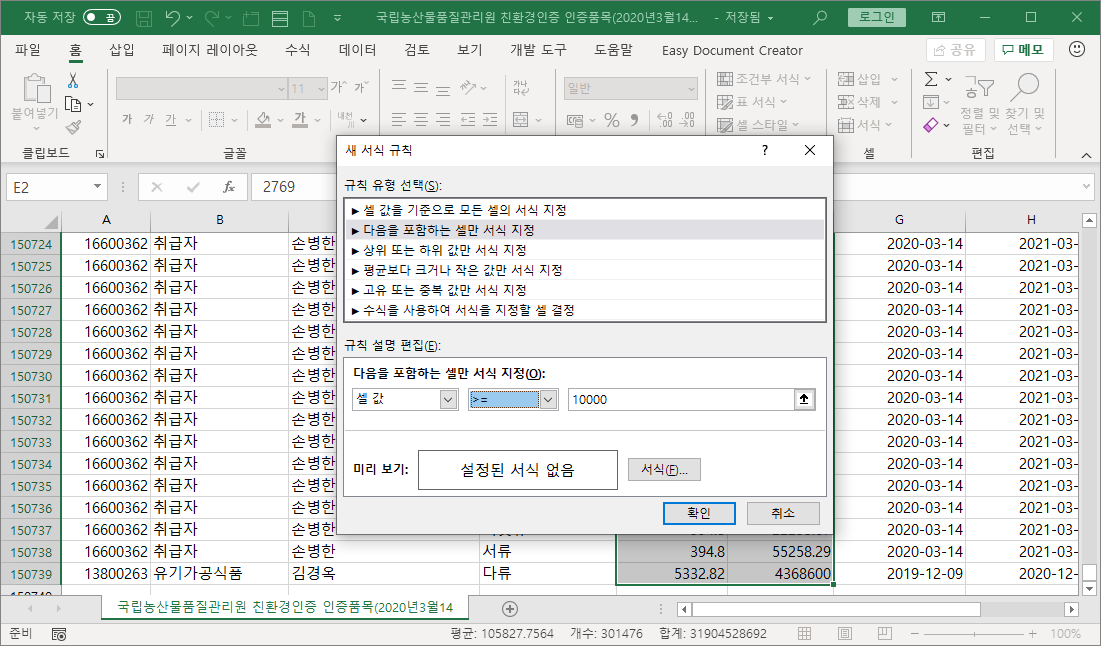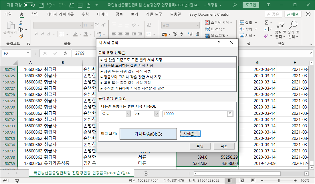 E, F열 데이터에 셀 값이 10,000 이상인 경우 채우기 색을 적용하도록 서식을 적용해 보겠습니다.