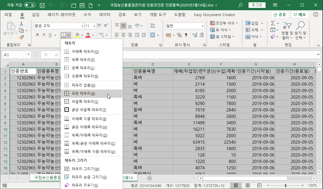 [홈]-[글꼴]-[테두리]를 선택해 [모든 테두리]를 누릅니다.