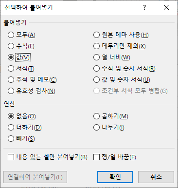 단축키 <Ctrl + C>를 눌러 복사하고, 바로 다시 단축키 <Ctrl + Alt + V>를 눌러 [선택하여 붙여넣기] 대화상자를 나타냅니다.