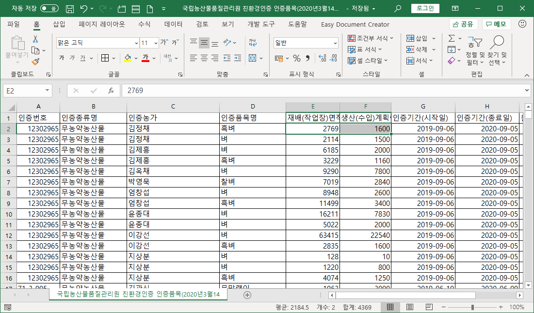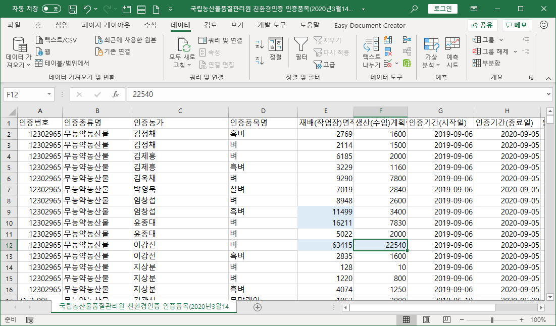CSV 형식의 파일을, 엑셀 파일 형식(*.XLSX)으로 저장하고, 열 너비만 보기 좋게 수정했습니다.