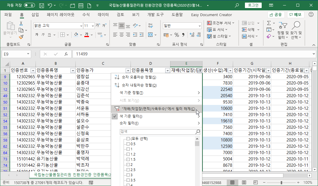 이 데이터는 [A:I] 열까지 8개의 필드로 구성되어 필드 개수가 많은 편은 아니지만 레코드 수가 15만개 이상이 되는 대용량 파일에 해당됩니다.
