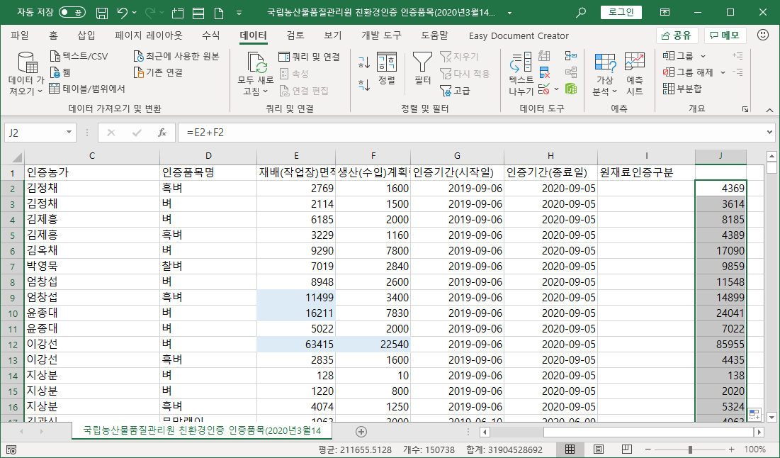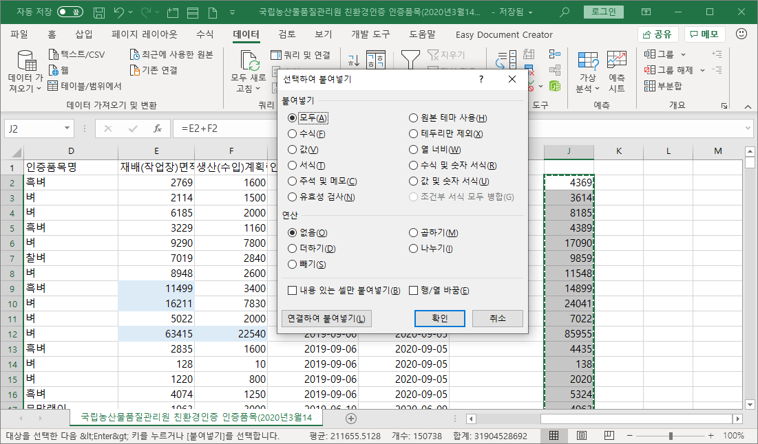 단축키 <Ctrl + Shift + 아래쪽 화살표>를 눌러 [E2:F150739] 셀 범위를 선택합니다.