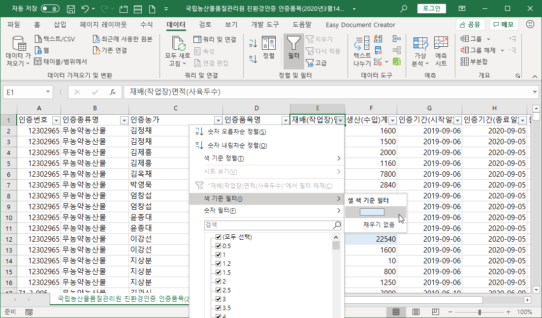 [E1] 셀 옆 역삼각형을 눌러 [색 기준 필터]에서 채우기 색이 적용된 항목을 선택합니다.
