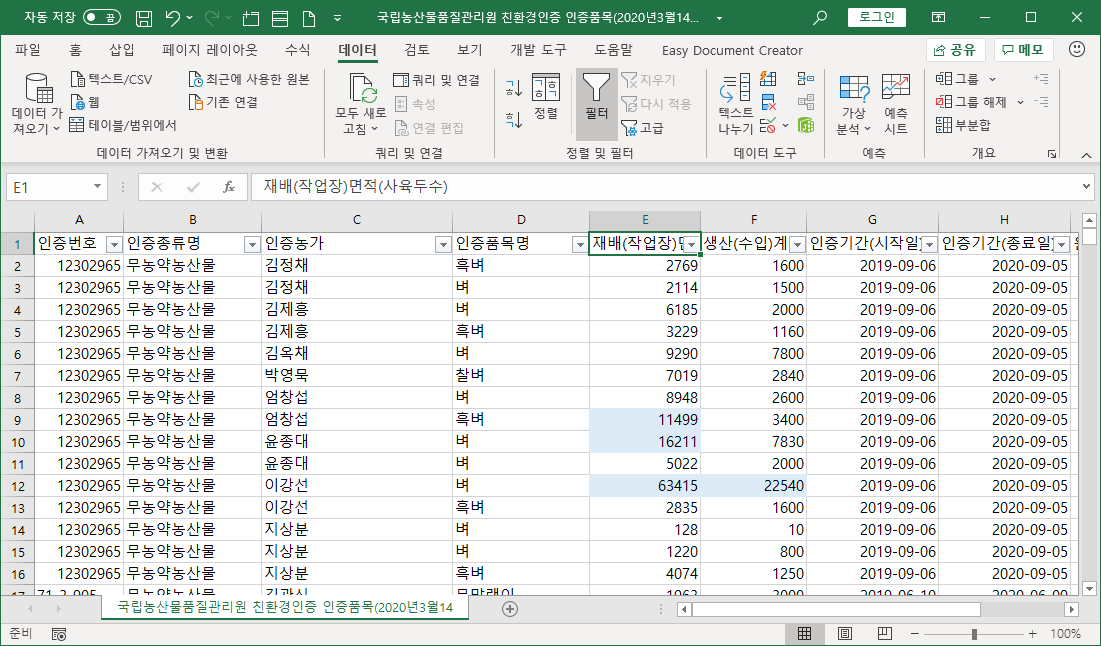 [E1] 셀에 커서를 두고 [데이터]-[필터]를 선택합니다.