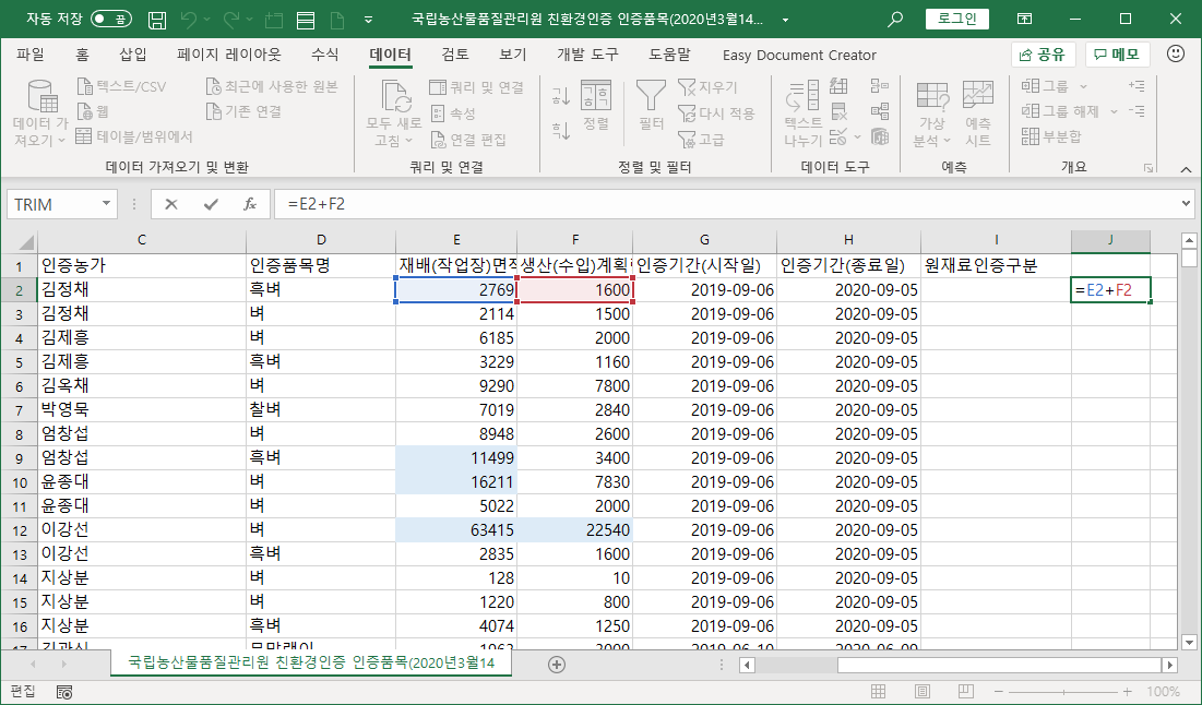 [J2] 셀을 선택해 =E2+F2 수식을 작성합니다.