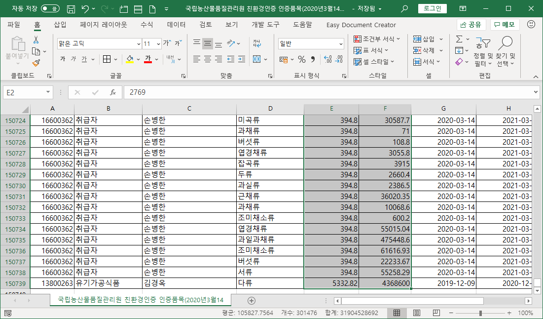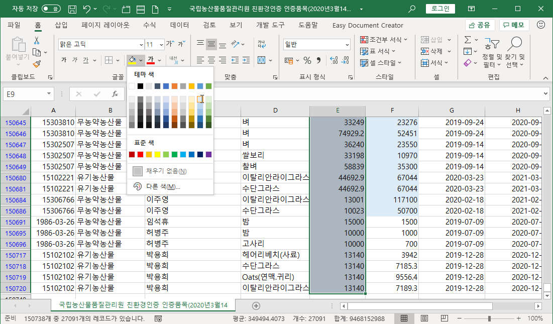 [E2:F150739] 셀 범위를 선택한 상태에서 [표시 형식]-[일반]을 선택합니다.
