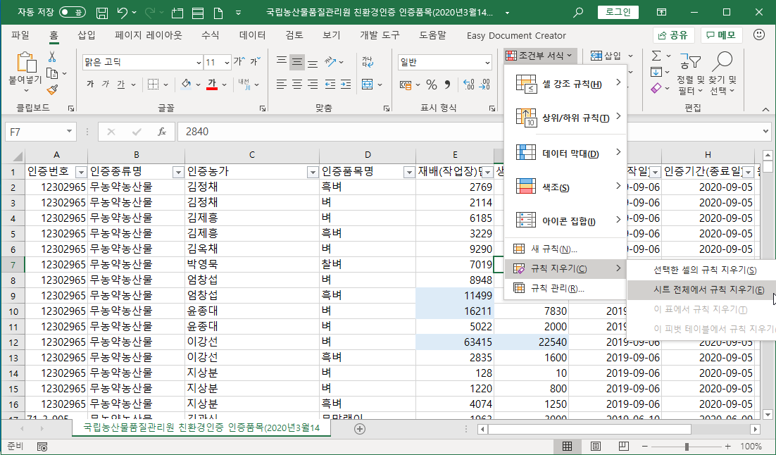 [홈]-[조건부 서식]-[규칙 지우기]-[시트 전체에서 규칙 지우기]를 선택합니다.