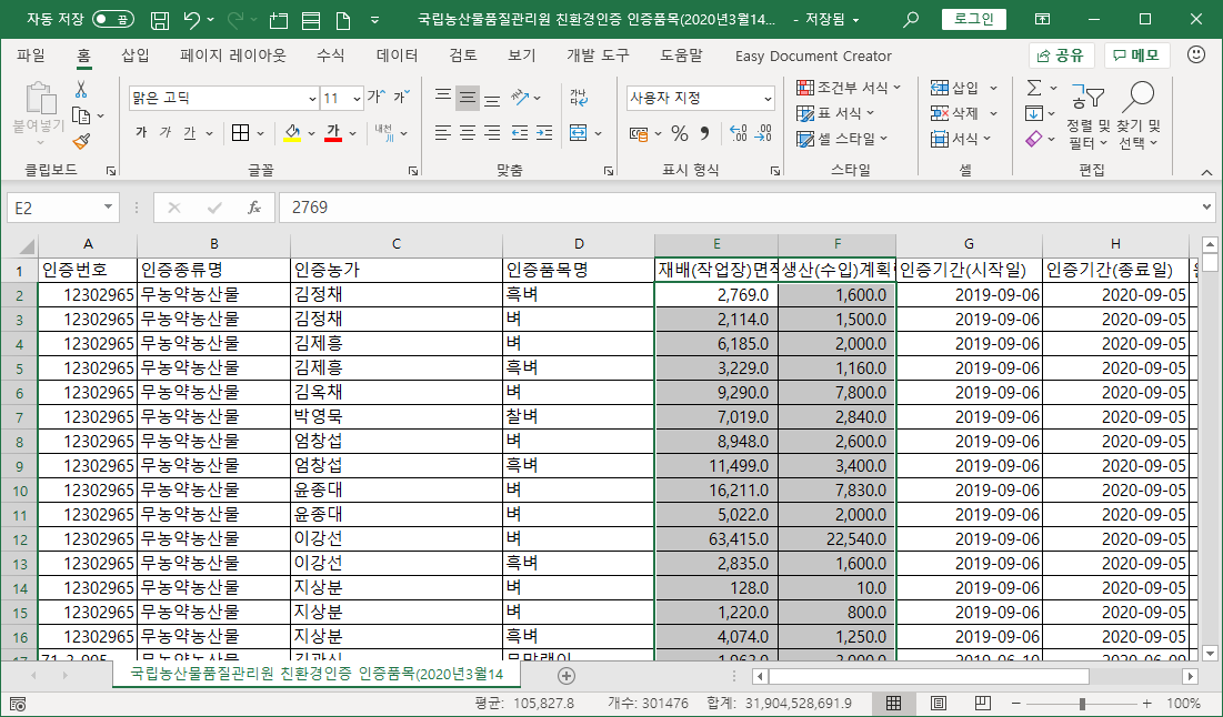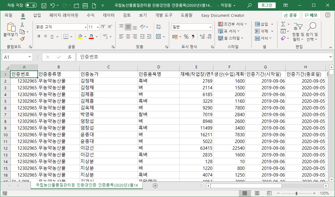 CSV 형식의 파일을, 엑셀 파일 형식(*.XLSX)으로 저장하고, 열 너비만 보기 좋게 수정했습니다.
