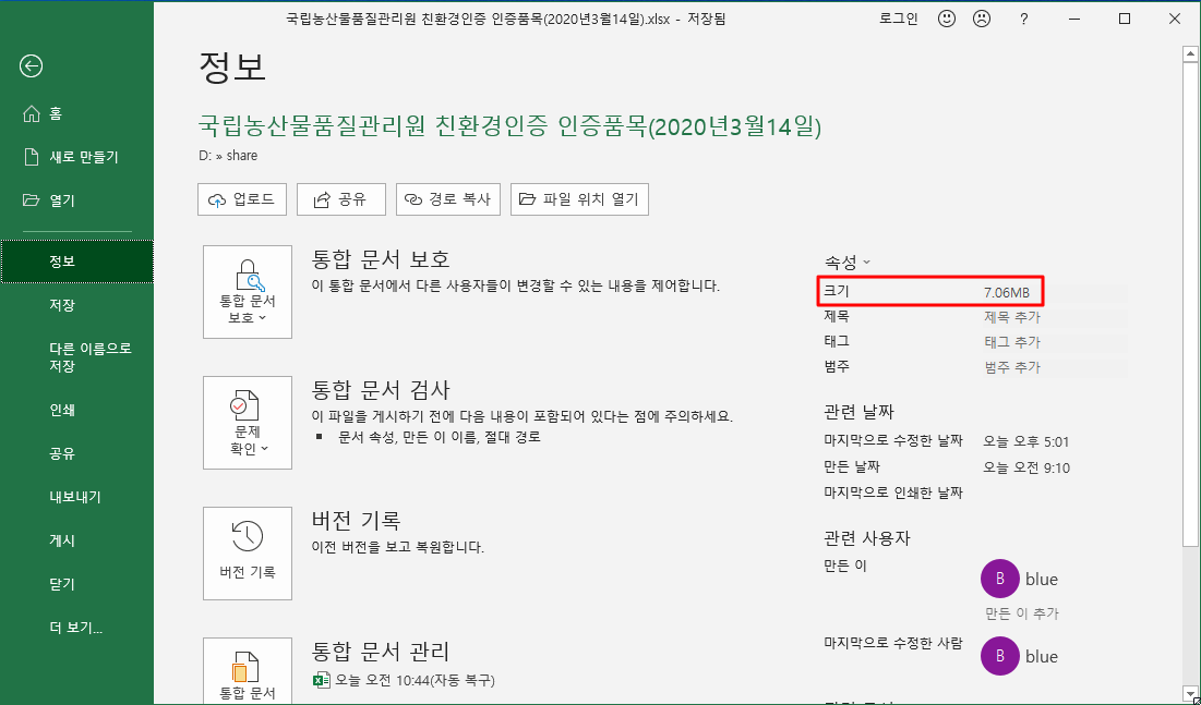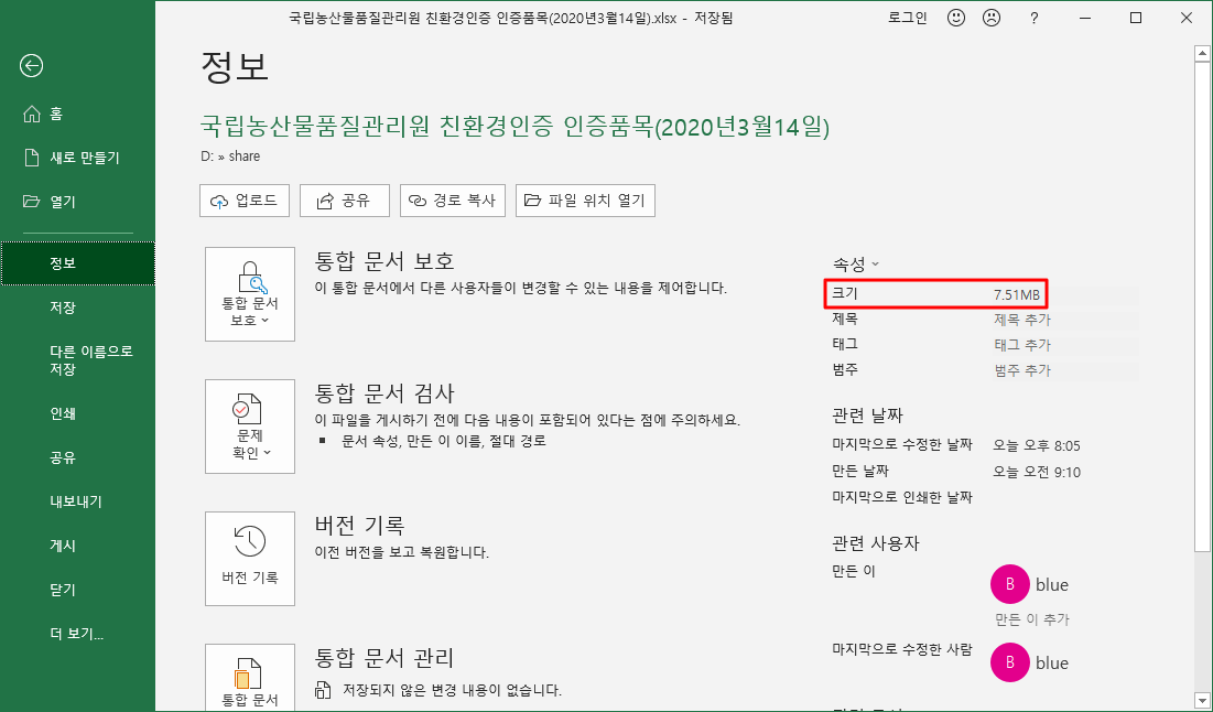 단축키 <Ctrl + S>를 눌러 저장하고, [홈]-[정보]에서 파일 용량을 확인하면 그대로 7.51MB 입니다.