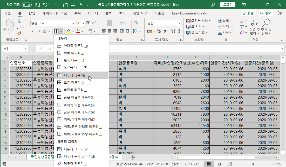 [A1] 셀에서 단축키 <Ctrl + *>를 눌러 데이터 범위 전체를 선택한 뒤 [글꼴]-[테두리]에서 [테두리 없음]을 선택합니다.