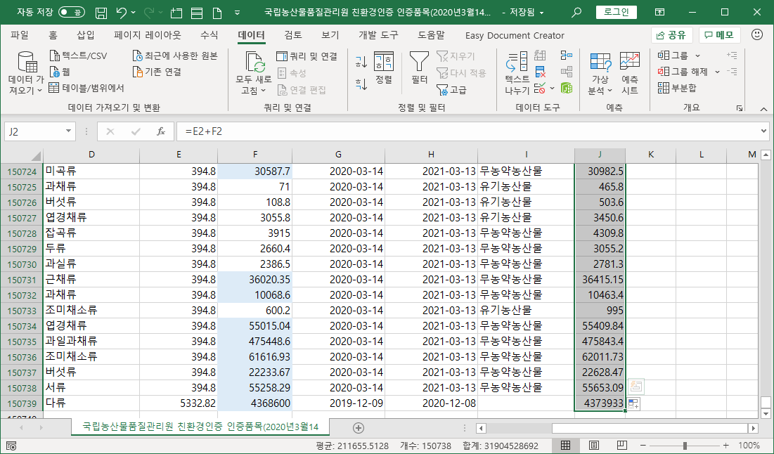[J2] 셀에 커서를 두고 단축키 <Ctrl + Shift + 아래쪽 화살표>를 눌러 [J2:J150739] 셀 범위를 선택합니다.