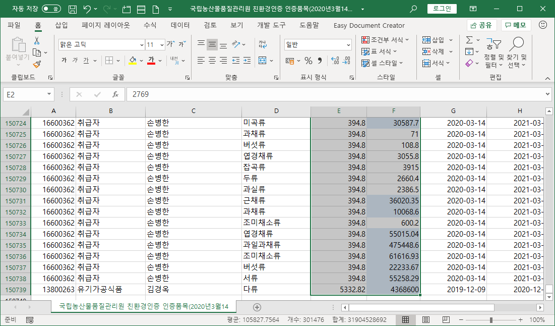 단축키 <Ctrl + Shift + 아래쪽 화살표>를 눌러 [E2:F150739] 셀 범위를 선택합니다.