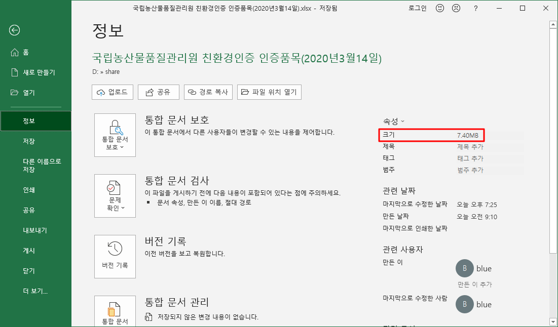 다시 [파일]-[정보]를 선택해 파일 용량을 확인해 보면 7.40MB로 늘어나 있습니다.