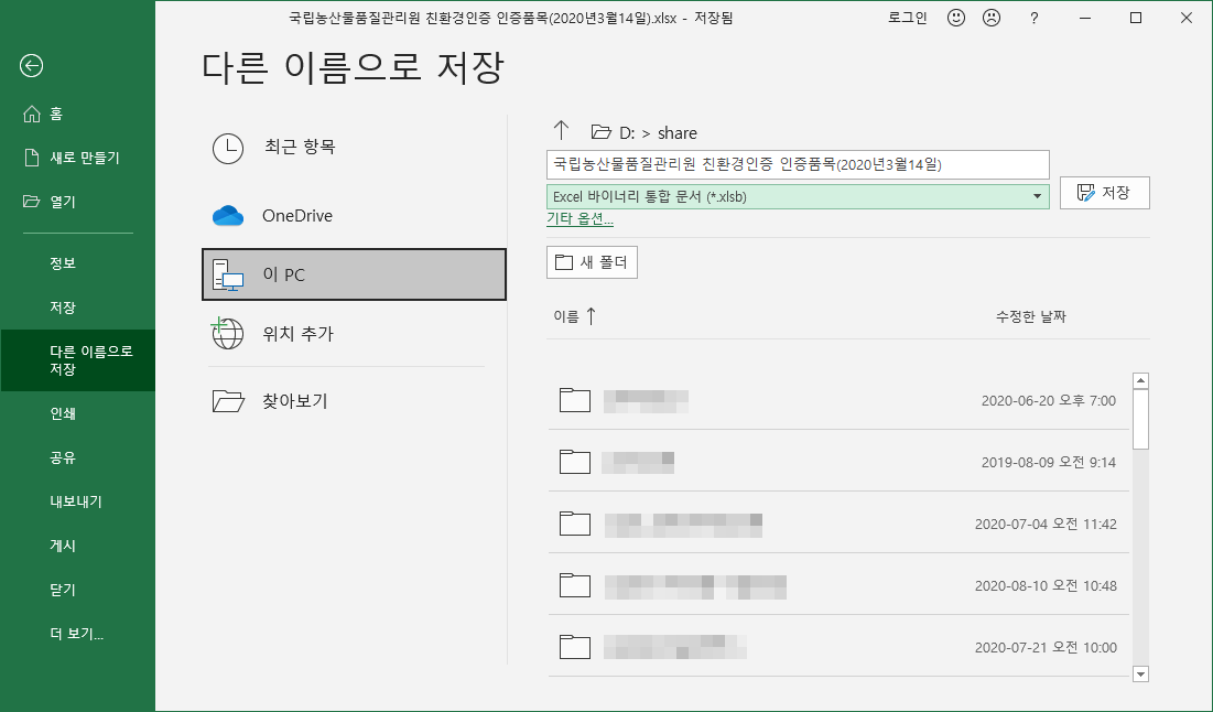파일 형식을 Excel 바이너리 통합 문서(*.xlsb)를 선택하고 [저장]을 누릅니다.