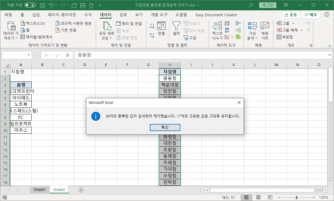 중복된 품명을 제거하기 위해 범위 선택된 상태에서 [데이터]-[데이터 도구]-[중복된 항목 제거]를 선택합니다.