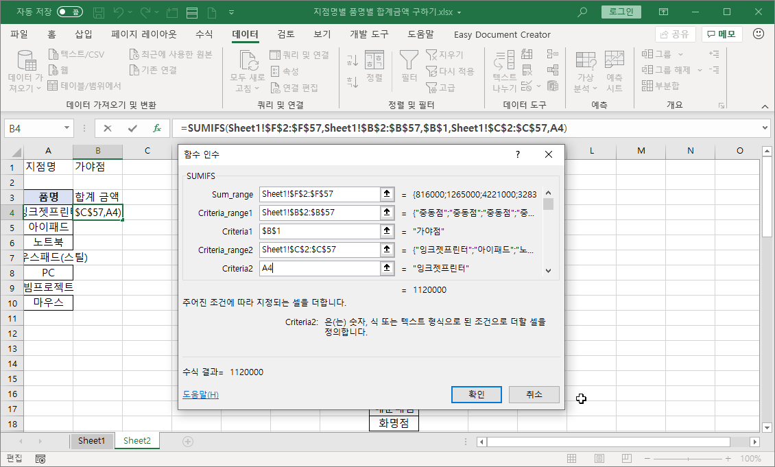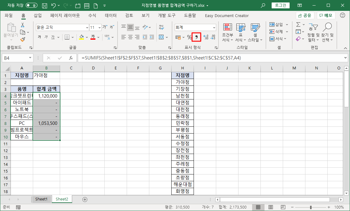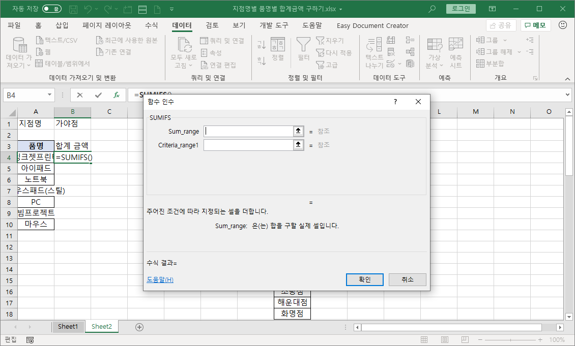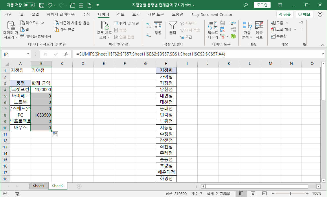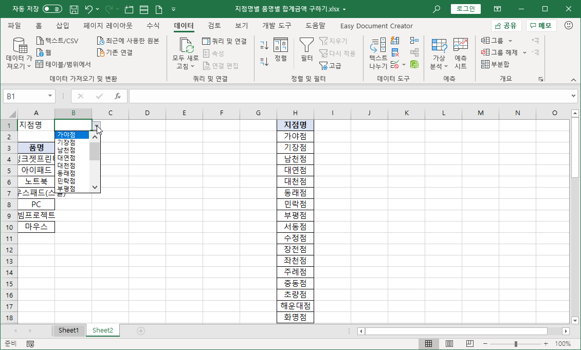 이번 강좌에서는 데이터 유효성 검사 기능으로 지점명 목록을 표시하고, 사용자가 지점명을 선택하면 품명별 판매금액 합계를 SUMIFS 함수로 수식을 작성해 나타내 보겠습니다.
