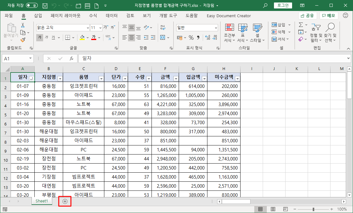 새 시트를 하나 추가해 지점별 품명별 판매금액을 나타냅니다.