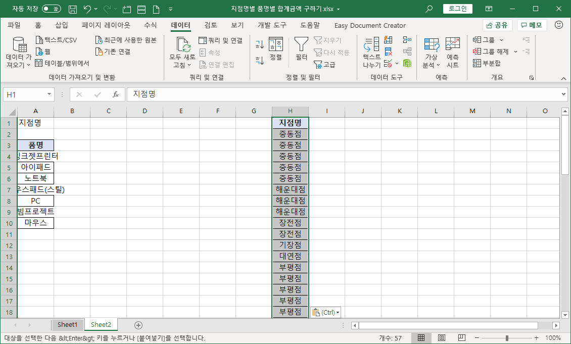 사용자가 지점명을 입력하지 않고 나타난 목록에서 선택하도록 데이터 유효성 검사 기능을 쓰기 위해 Sheet1 시트에서 지점명 [B1:B57] 셀 범위를 복사해 Sheet2 [H1] 셀에 붙여넣습니다.