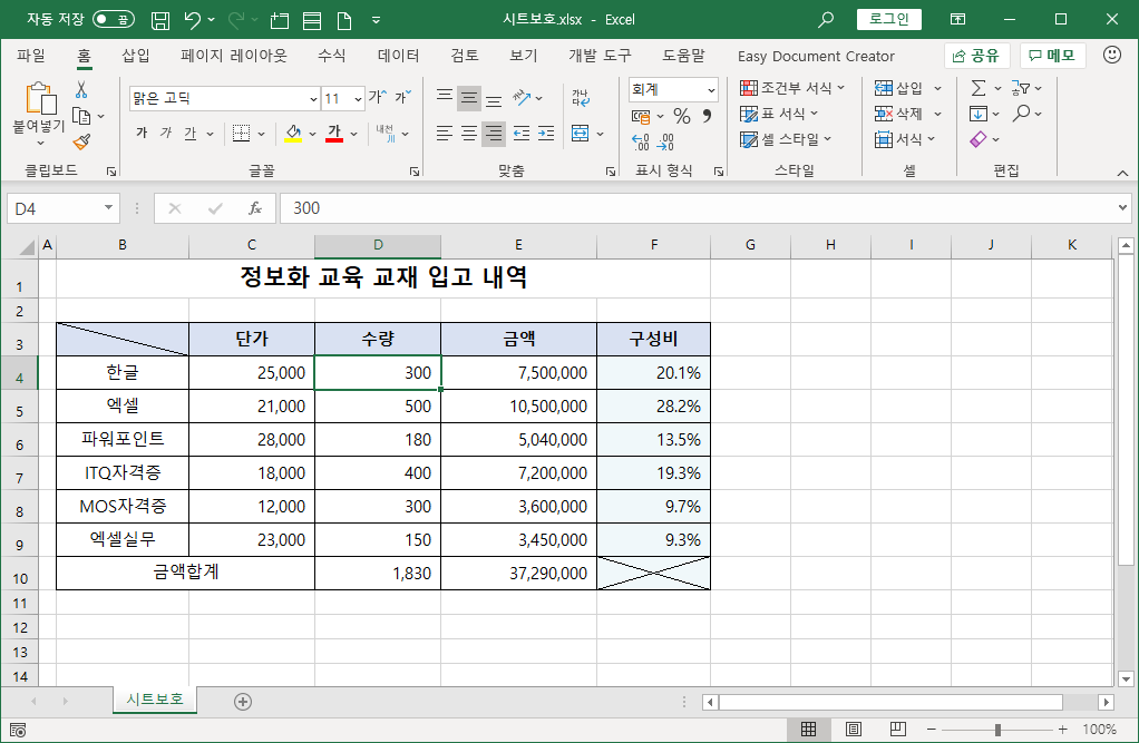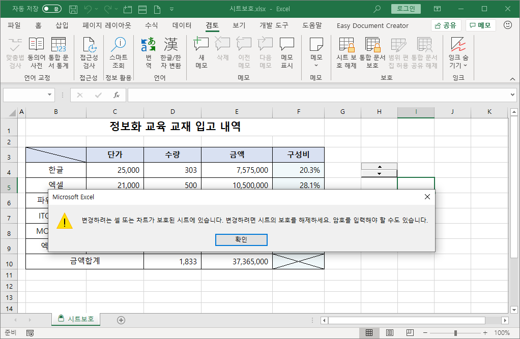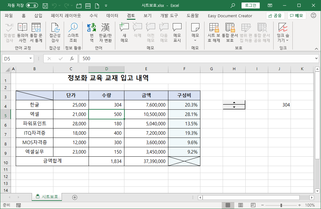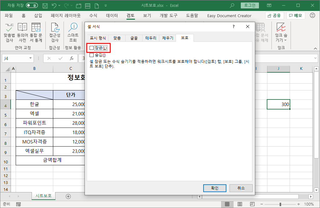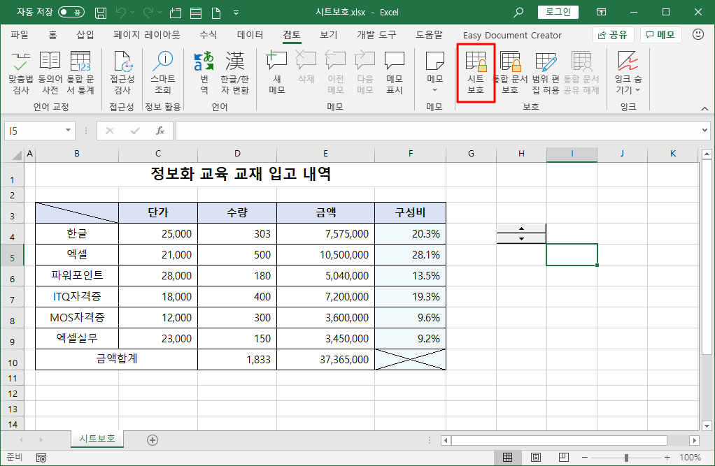 이제 사용자가 직접 [D4] 셀 값을 바꿀 수 없도록 [검토]-[보호]-[시트 보호]를 선택합니다.
