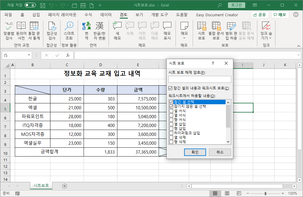 다시 [시트 보호]를 합니다.