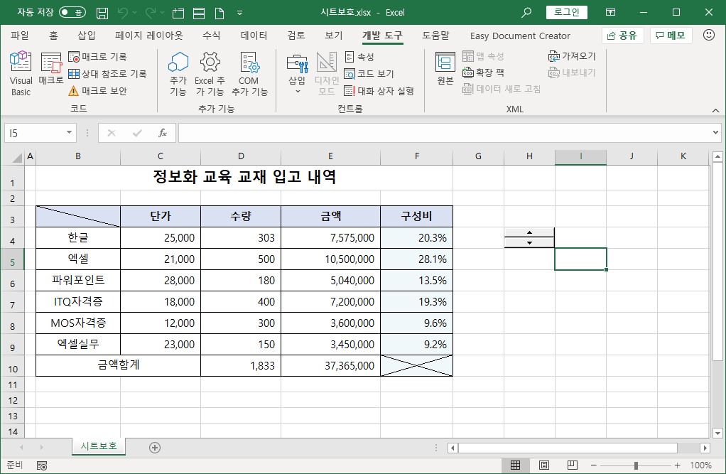 스핀 단추와 연결된 셀은 [J4] 셀이고, [J4] 셀은 [잠금]을 해제했기 때문에 [시트 보호]가 된 상태에서도 값을 바꿀 수 있습니다.