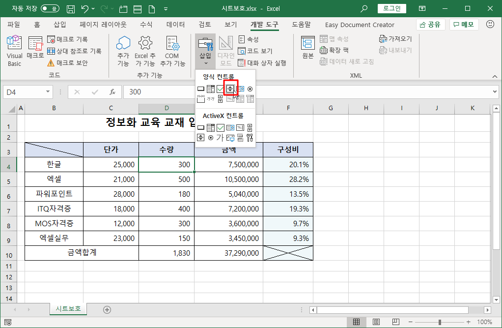 [D4] 셀 값을 사용자가 직접 바꾸지 못하도록 하기 위해 스핀 단추를 연결하겠습니다.