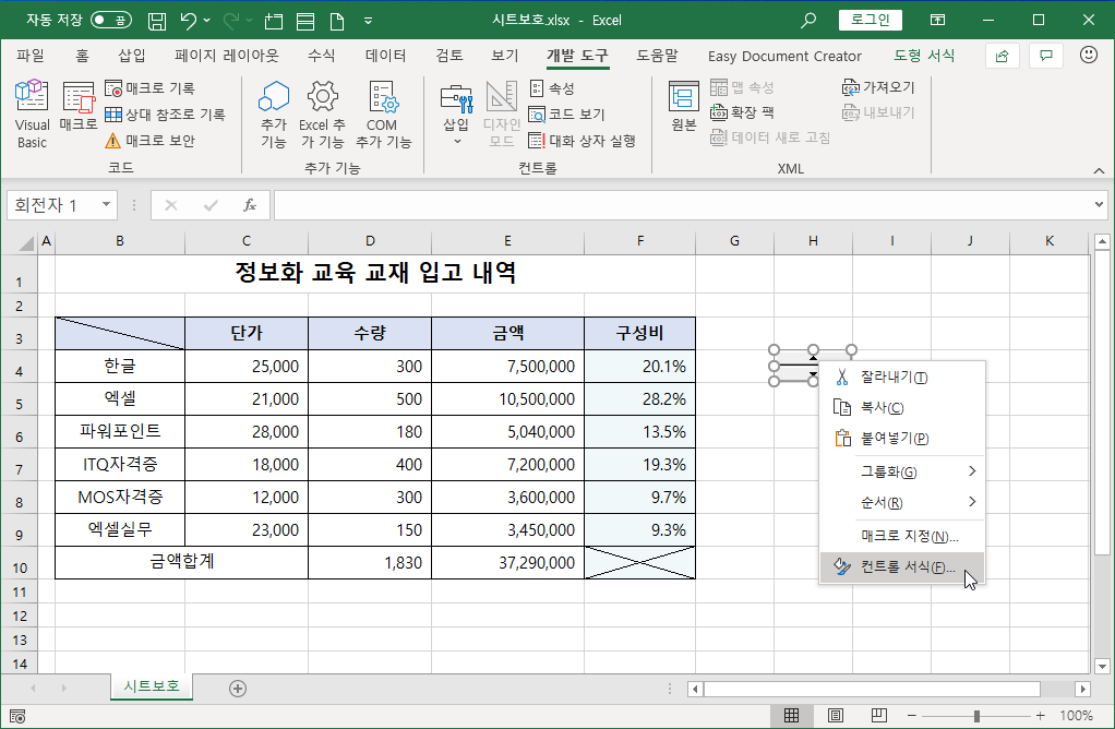 [H4] 셀 스핀 단추를 마우스 오른쪽 단추를 바로 눌러 컨트롤 서식을 선택합니다.