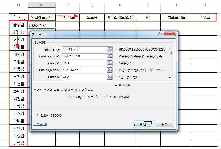 두 번째 인수는 조건을 입력합니다. 집계표의 첫 번째 지점명 셀입니다.