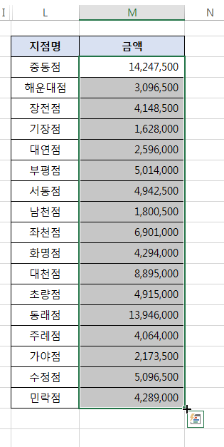 이때 나머지 지점에 해당하는 금액의 합을 구하기 위해 수식을 복사하면 참조 셀이 변합니다.