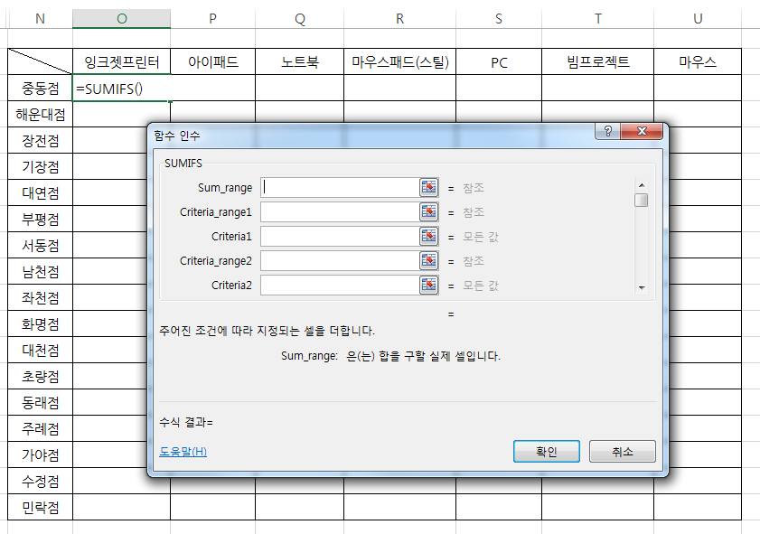 첫 번째 인수 Range에는 일자별 판매내역에 있는 지점명 범위를 지정합니다.