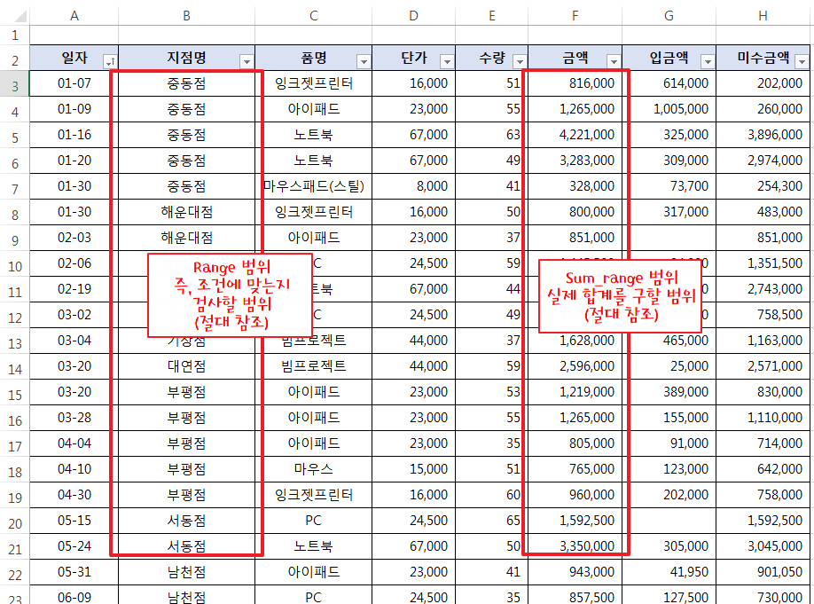 그래서 지점명 범위와 금액 범위는 절대 참조해야 합니다.