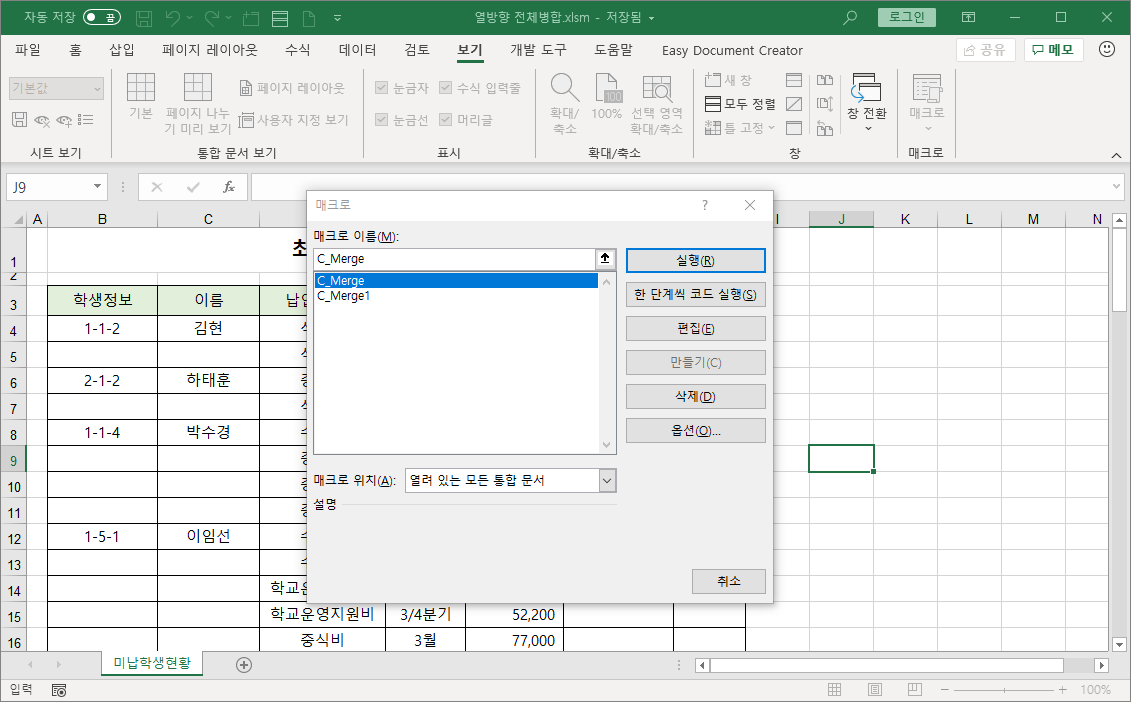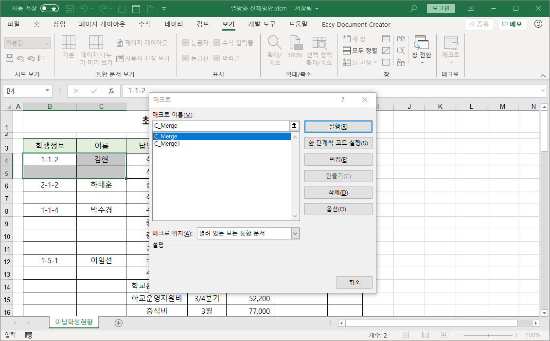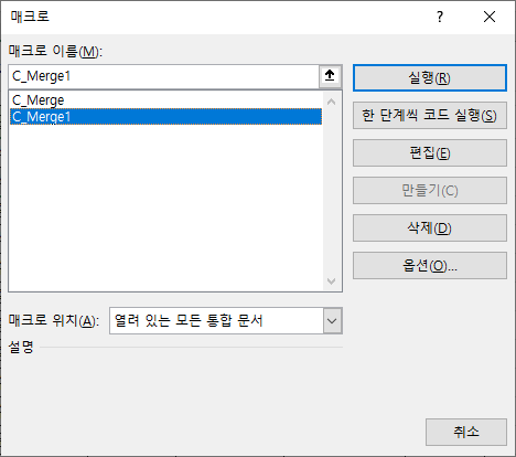 매크로 C_Merge가 선택된 상태에서 [실행]을 누릅니다.