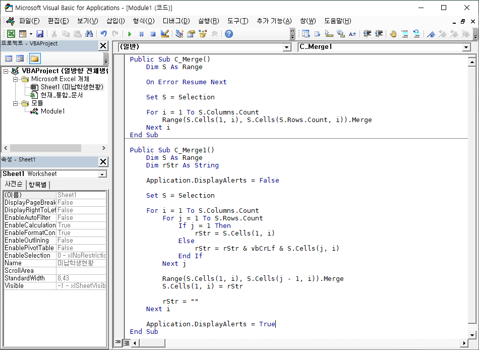 두번째 매크로 C_Merge1은 선택된 범위에서 열방향으로 병합을 하는데, 병합된 후 각 셀에 있던 내용을 <Enter>로 줄바꿈해서 셀에 표시됩니다.
