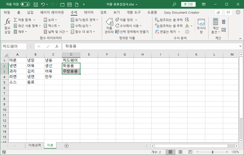 물품종류를 1행에 입력하고, 2행부터 세부종류를 적었습니다.