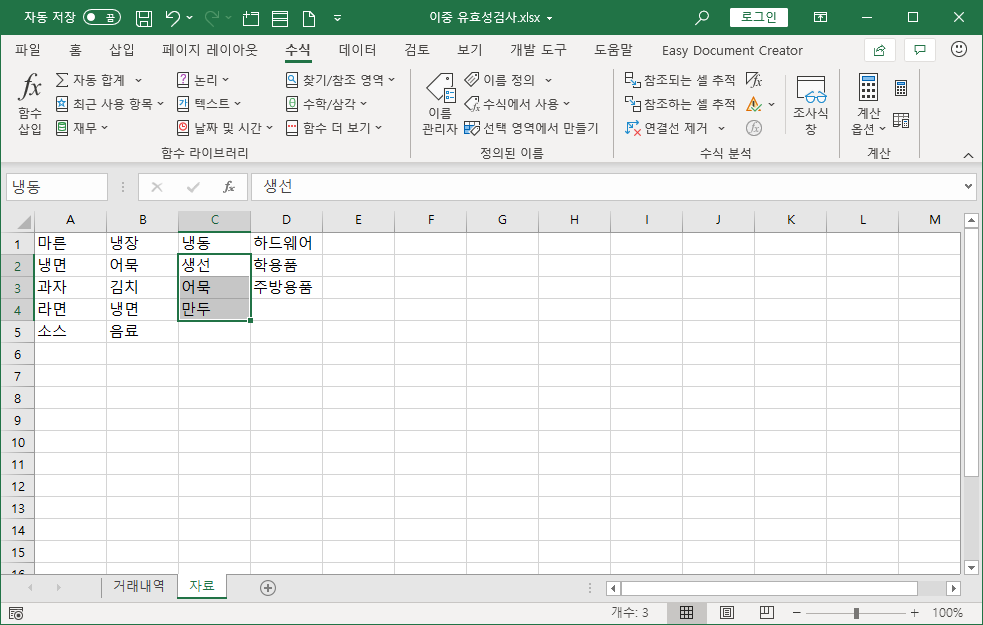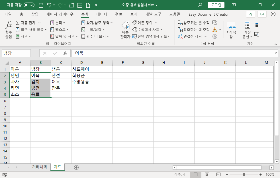 [B2] 셀에 냉장을 선택한 뒤 [C2] 셀에서 어묵을 선택합니다.