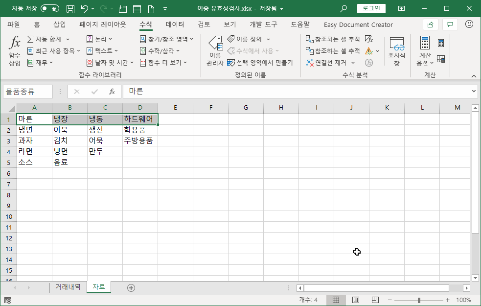 물품종류를 1행에 입력하고, 2행부터 세부종류를 적었습니다.