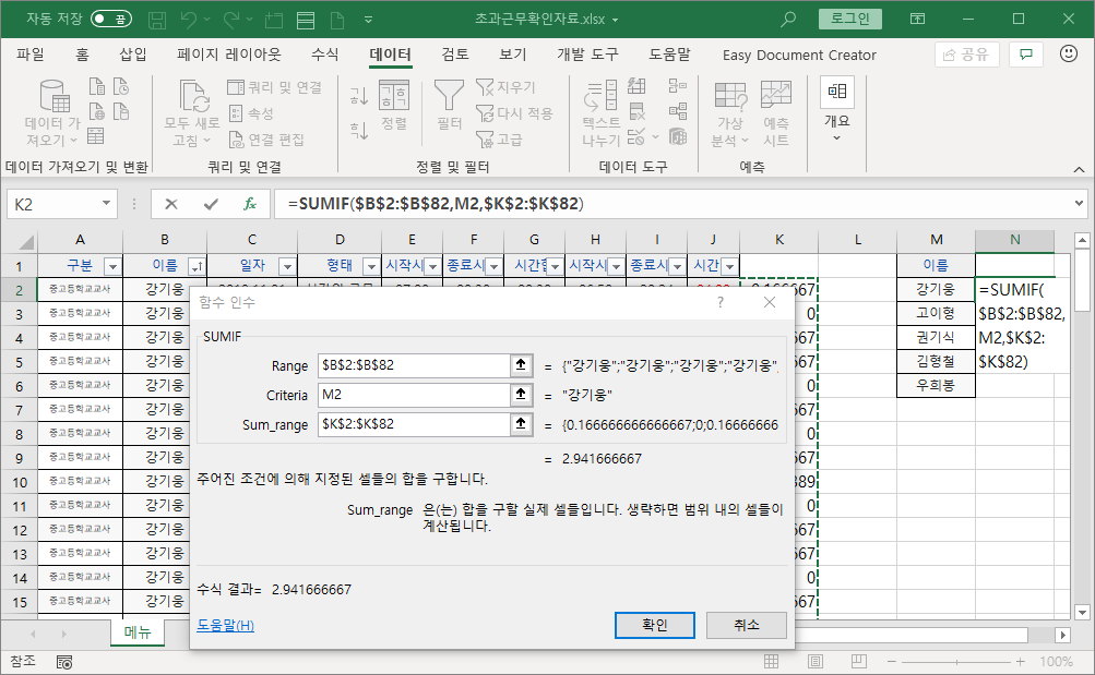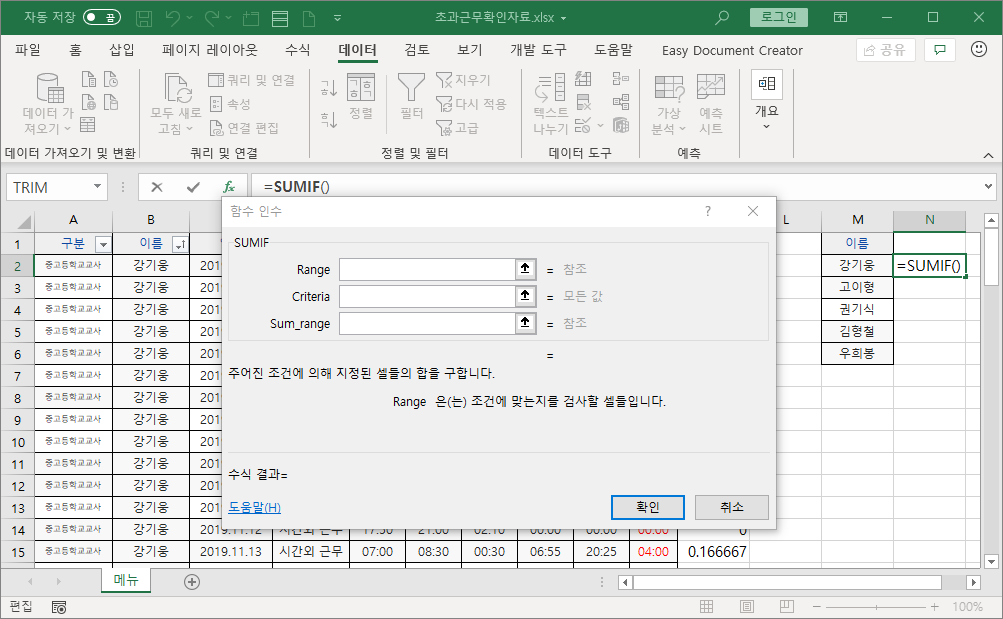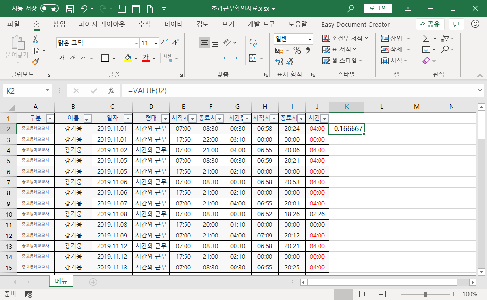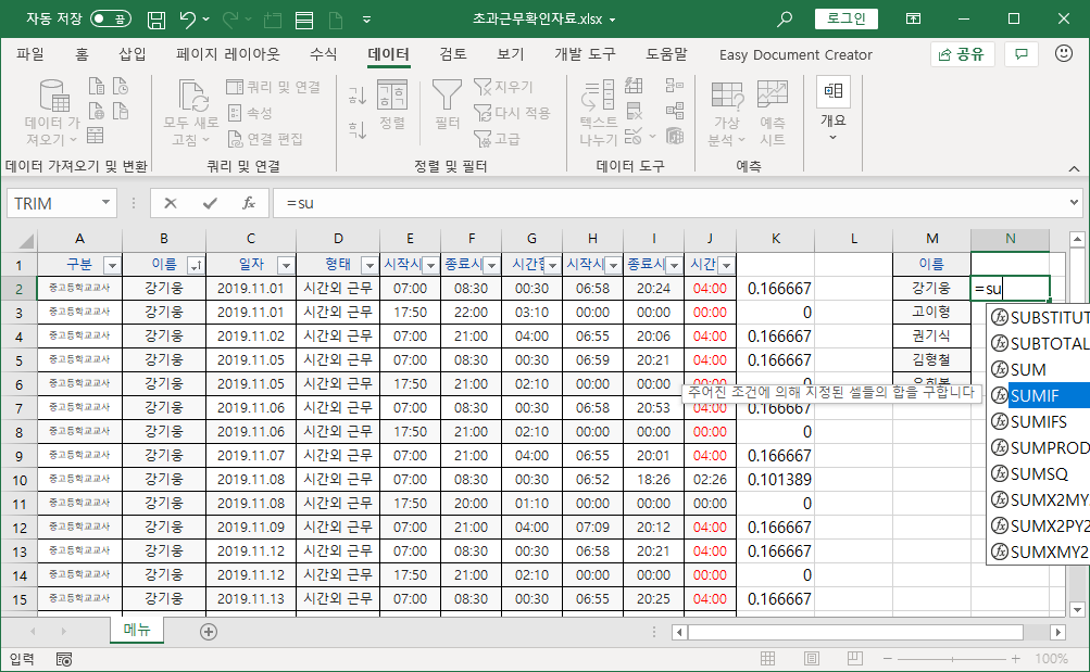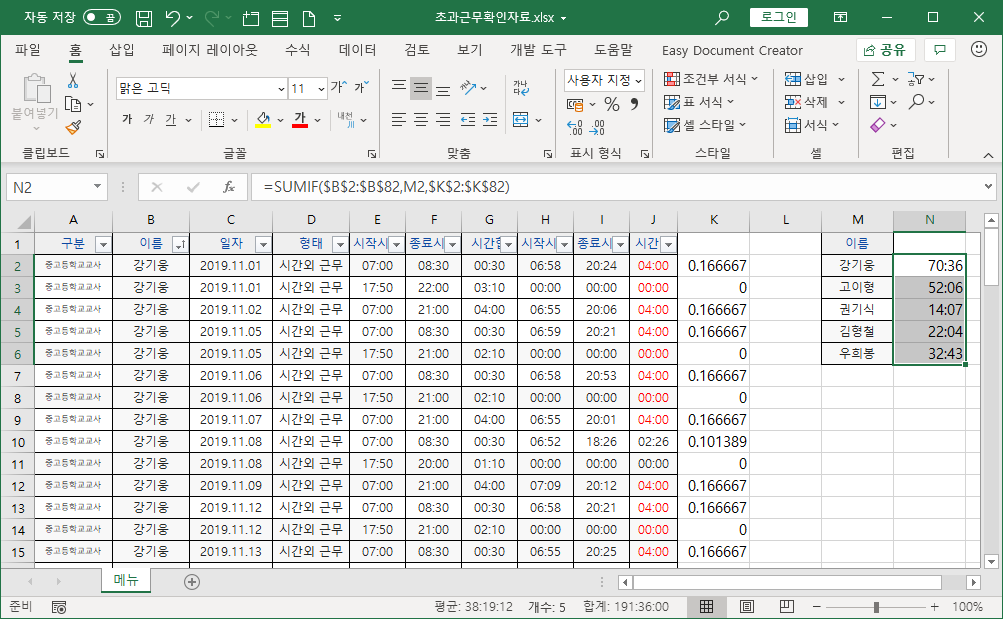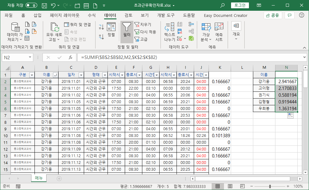 학교 업무 프로그램에서 다운로드한 엑셀 파일 데이터를 이용해서 일자별 초과근무시간으로 개인별 초과근무시간 합계를 구하려고 합니다.