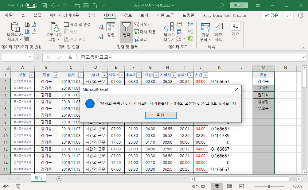 이제 이름별 초과근무시간 합을 구하기 위해 B열 이름 항목을 M열에 복사하고 [중복된 항목 제거]를 합니다.