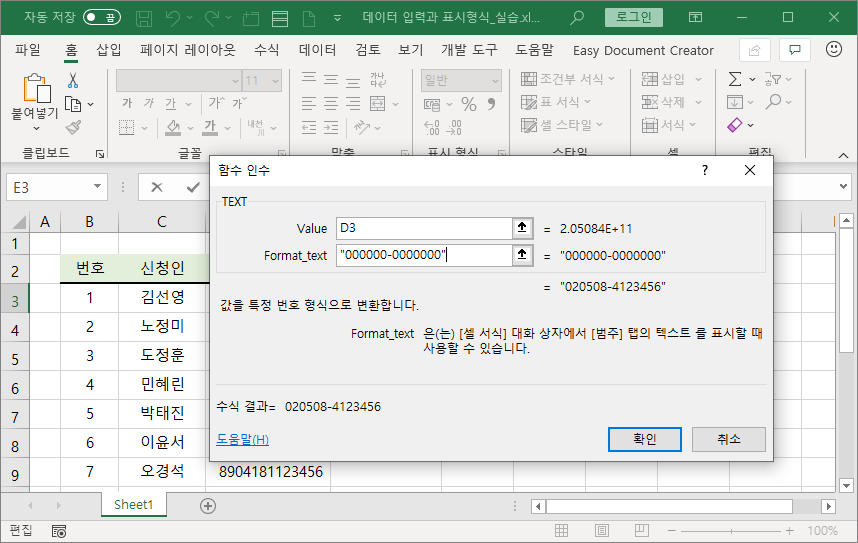Format_text 인수에 "000000-0000000" 형식을 입력합니다.